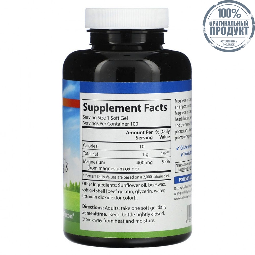 Carlson, Магниевые гели, 400 мг, 100 мягких таблеток