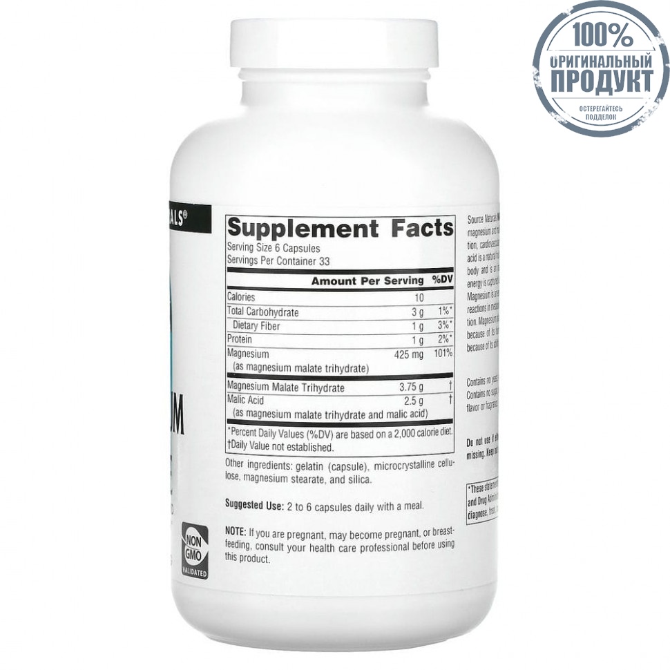 Препарат «Яблочнокислый магний» от Source Naturals сочетает в себе магний и яблочную кислоту. Он поддерживает мышечную функцию, здоровье сердечно-сосудистой системы и способствует производству энергии. Яблочная кислота — натуральная фруктовая кислота, содержащаяся в большинстве клеток организма и участвует в цикле Кребса, в котором энергия сохраняется во время метаболизма углеводов и жиров. Магний — кофактор, необходимый для более чем 300 ферментных реакций метаболизма, синтеза АТФ и производства энергии. Магний играет важную роль в расслаблении мышц, поскольку является кофактором ферментов, а также способен уравновешивать уровень кальция в клетках.